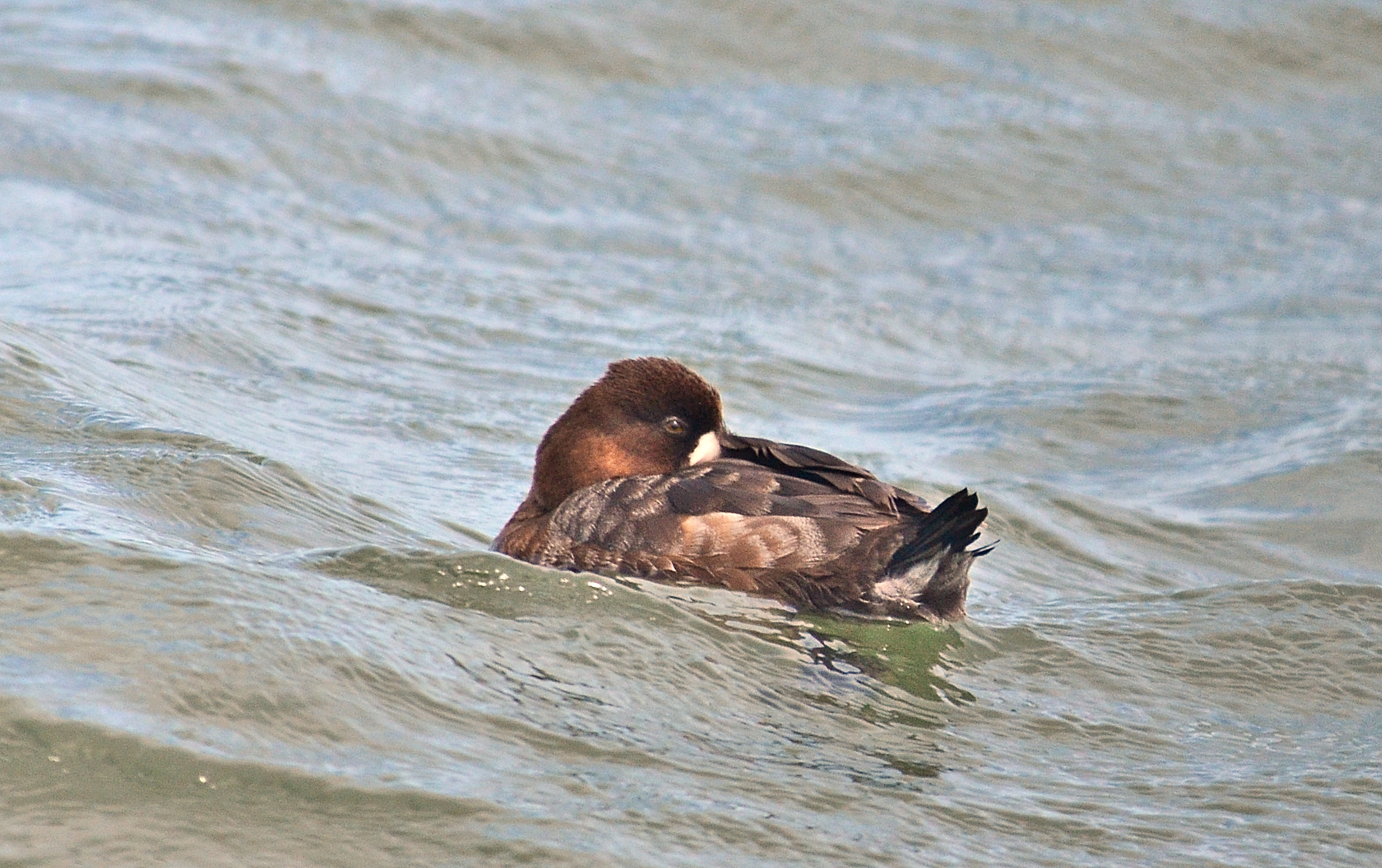 Still looking for the long tailed duck, I see this duck swimming alone in the waves. I can’t tell what it is all curled up like that.